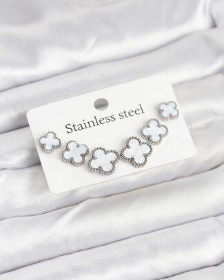 316L Çelik Gümüş Beyaz Renk 3 Boy Yonca Küpe Seti