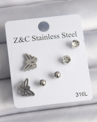 316L Çelik Gümüş Renk Zirkon Taşlı Kelebek Model Kadın Küpe Seti