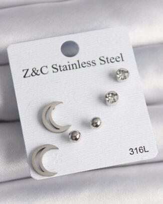 316L Çelik Gümüş Renk Zirkon Taşlı Hilal Model Kadın Küpe Seti