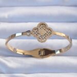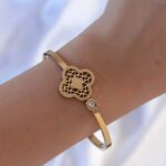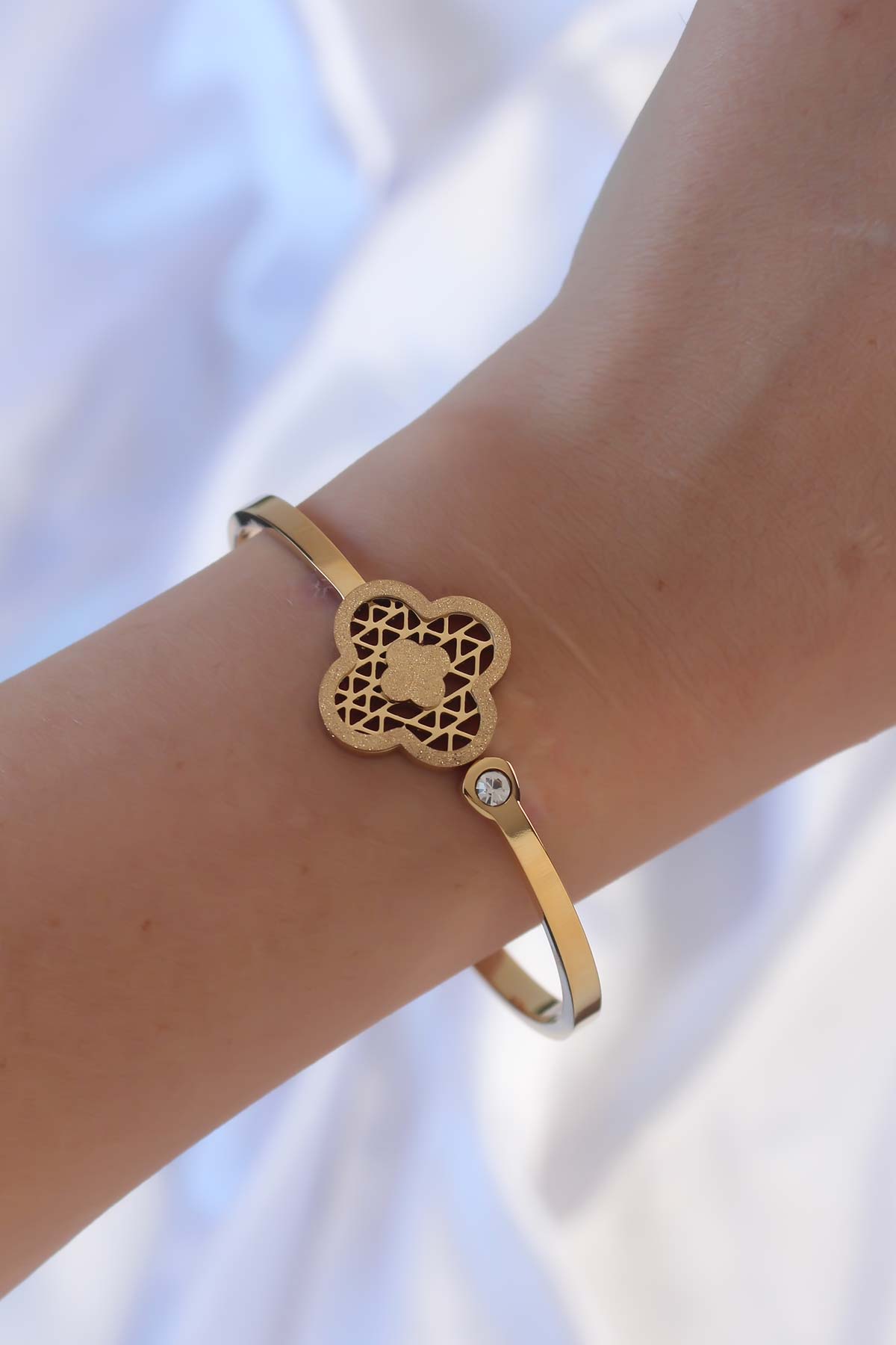 316L Çelik Altın Renk Zirkon Taşlı Simli Yonca Kelepçe