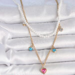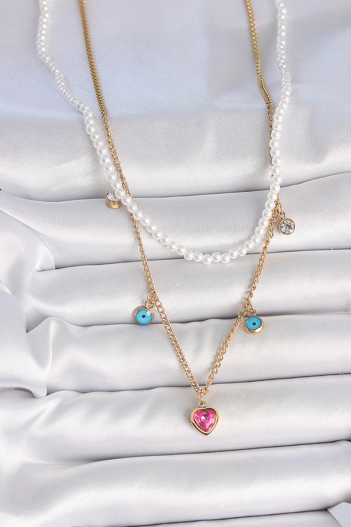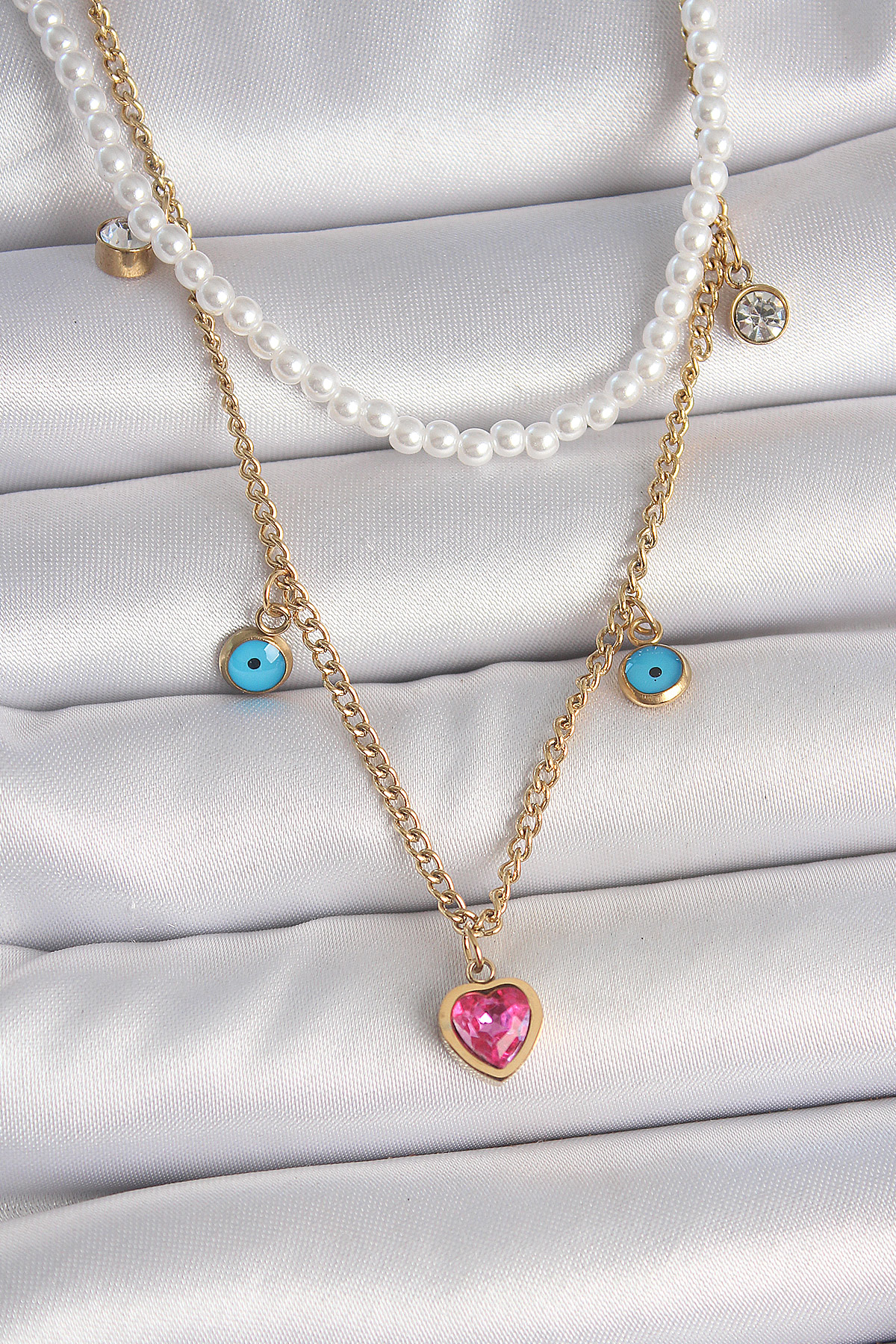 316L Çelik Gold Renk 2’Li İnci Zincir Model Pembe Taşlı Kalp Figür Nazar Boncuk Detay Kadın Kolye