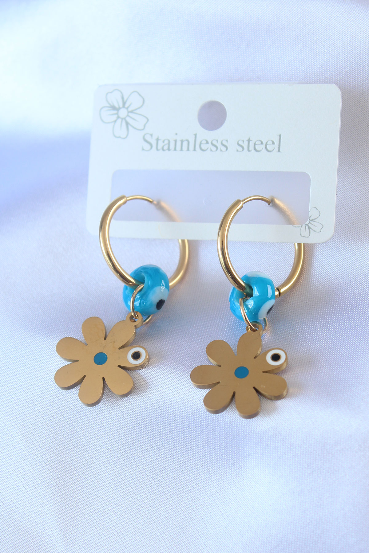 316L Çelik Gold Renk Çiçek Model Nazar Boncuk Detay Kadın Küpe