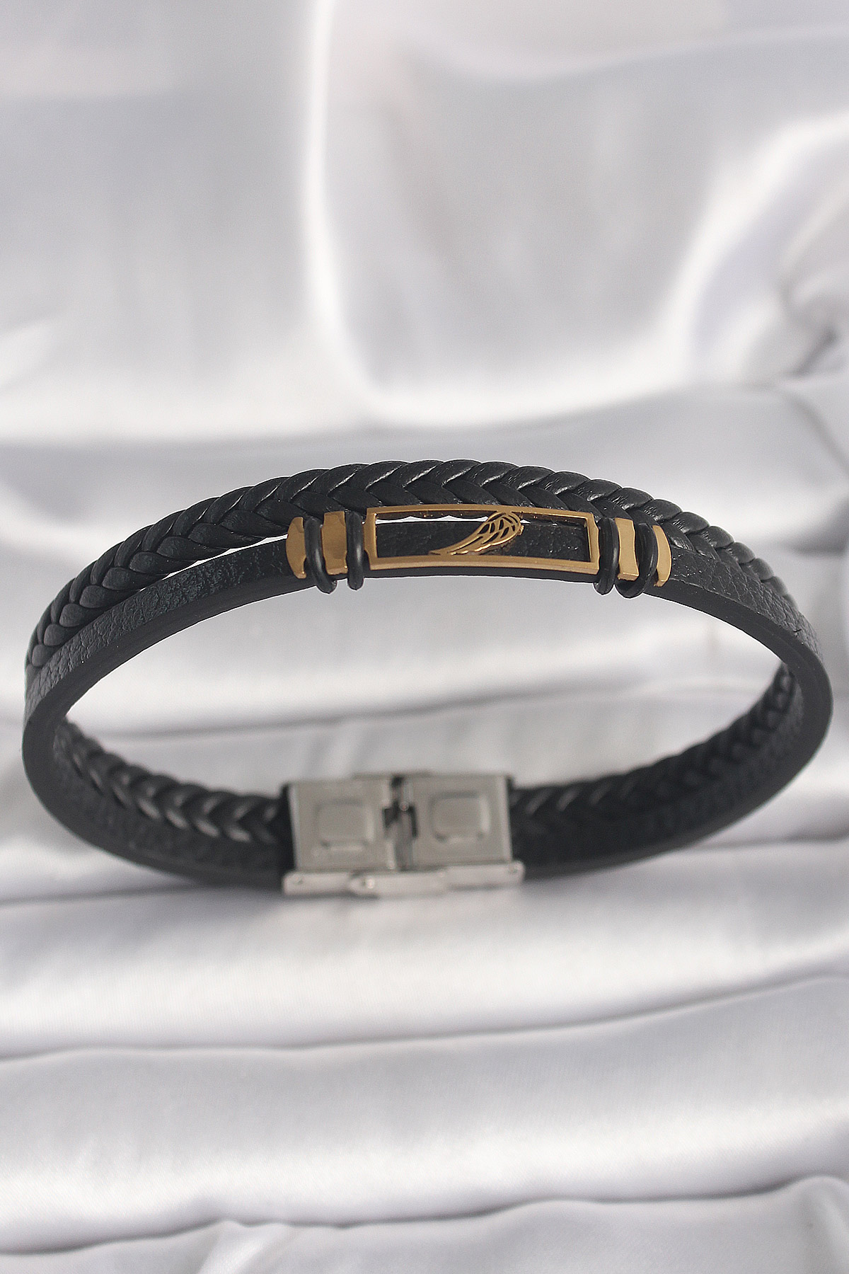 316L Çelik Gold Renk Kanat Aksesuarlı Siyah Burgu Model Deri Kordon Erkek Bileklik
