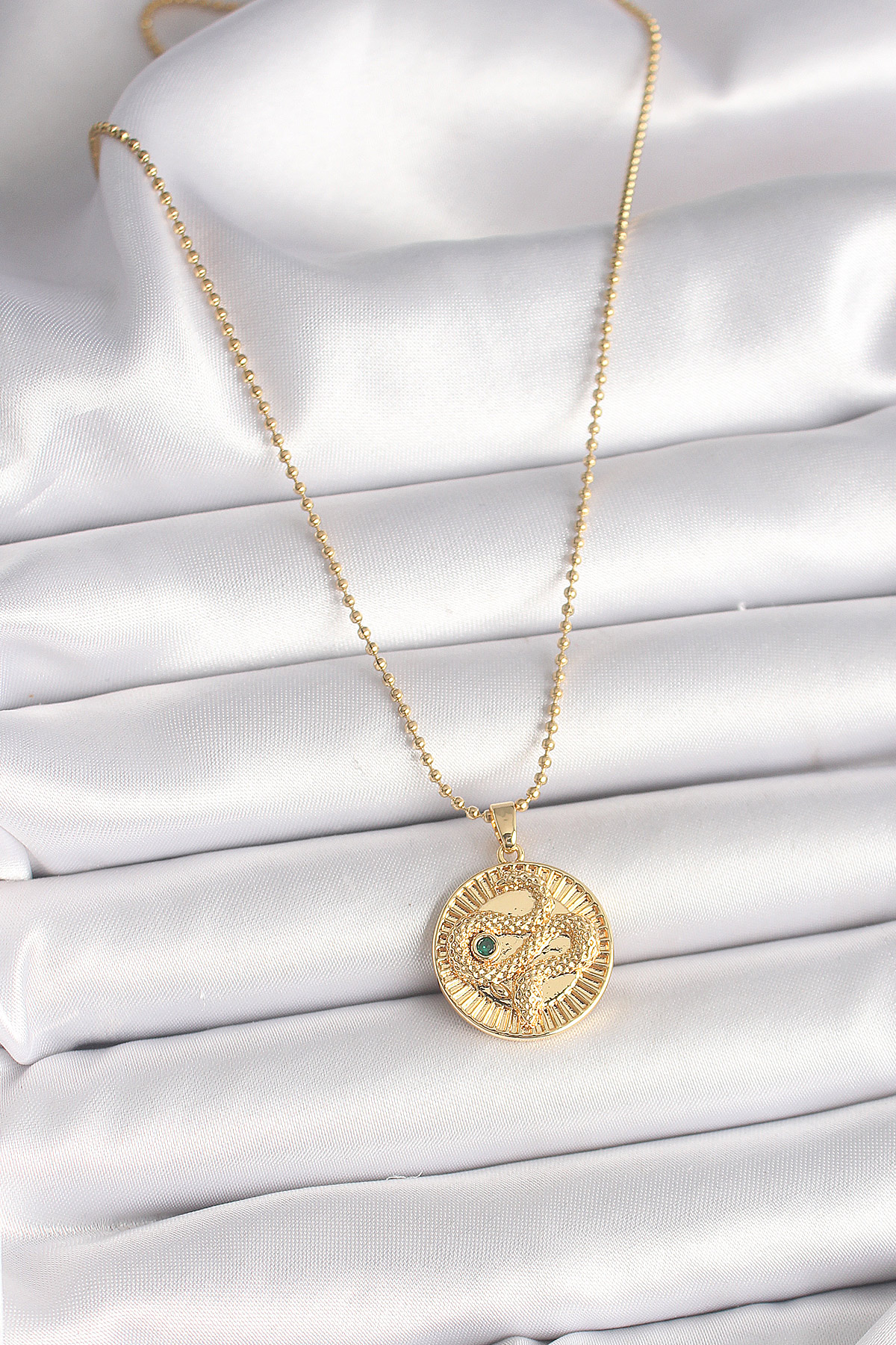 316L Çelik Gold Renk Topçuk Zincir Yılan İşlemeli Zirkon Taş Detaylı Madalyon Model Kadın Kolye