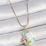 316L Çelik Gold Renk Zincir Mavi Mineli İncili Çiçek İşlemeli Portre Model Kadın Kolye
