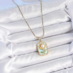 316L Çelik Gold Renk Zincir Mavi Mineli İncili Papatya İşlemeli Portre Model Kadın Kolye