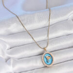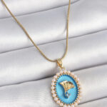 316L Çelik Gold Renk Zincir Mavi Mineli İncili Zirkon Taşlı Çiçek İşlemeli Portre Model Kadın Kolye