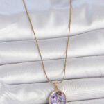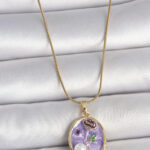 316L Çelik Gold Renk Zincir Mor Çiçek İşlemeli İnci Detay Portre Model Kadın Kolye