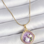 316L Çelik Gold Renk Zincir Mor Mineli İncili Çiçek İşlemeli Portre Model Kadın Kolye