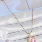 316L Çelik Gold Renk Zincir Pembe Mineli İncili Çiçek İşlemeli Portre Model Kadın Kolye