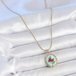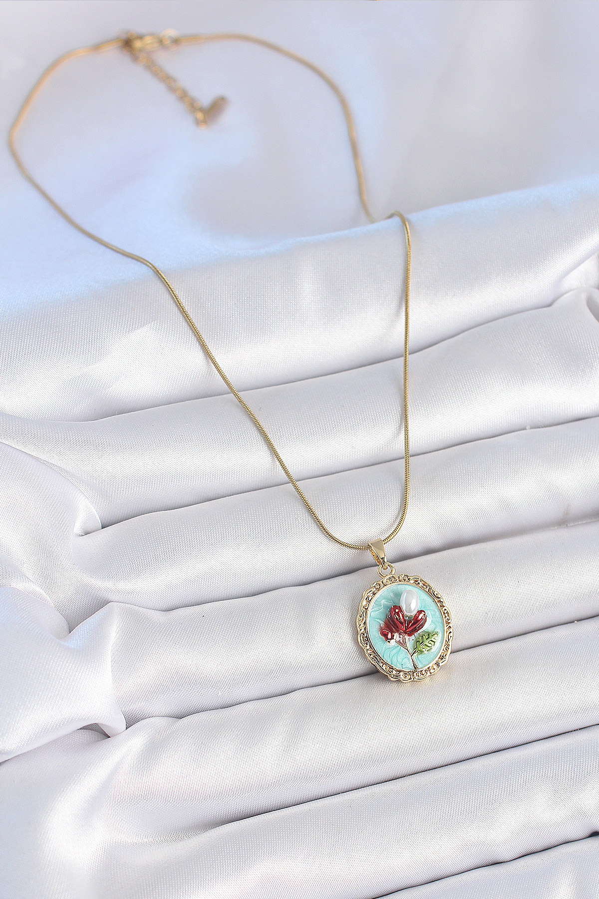 316L Çelik Gold Renk Zincir Turkuaz Mineli İncili Çiçek İşlemeli Portre Model Kadın Kolye