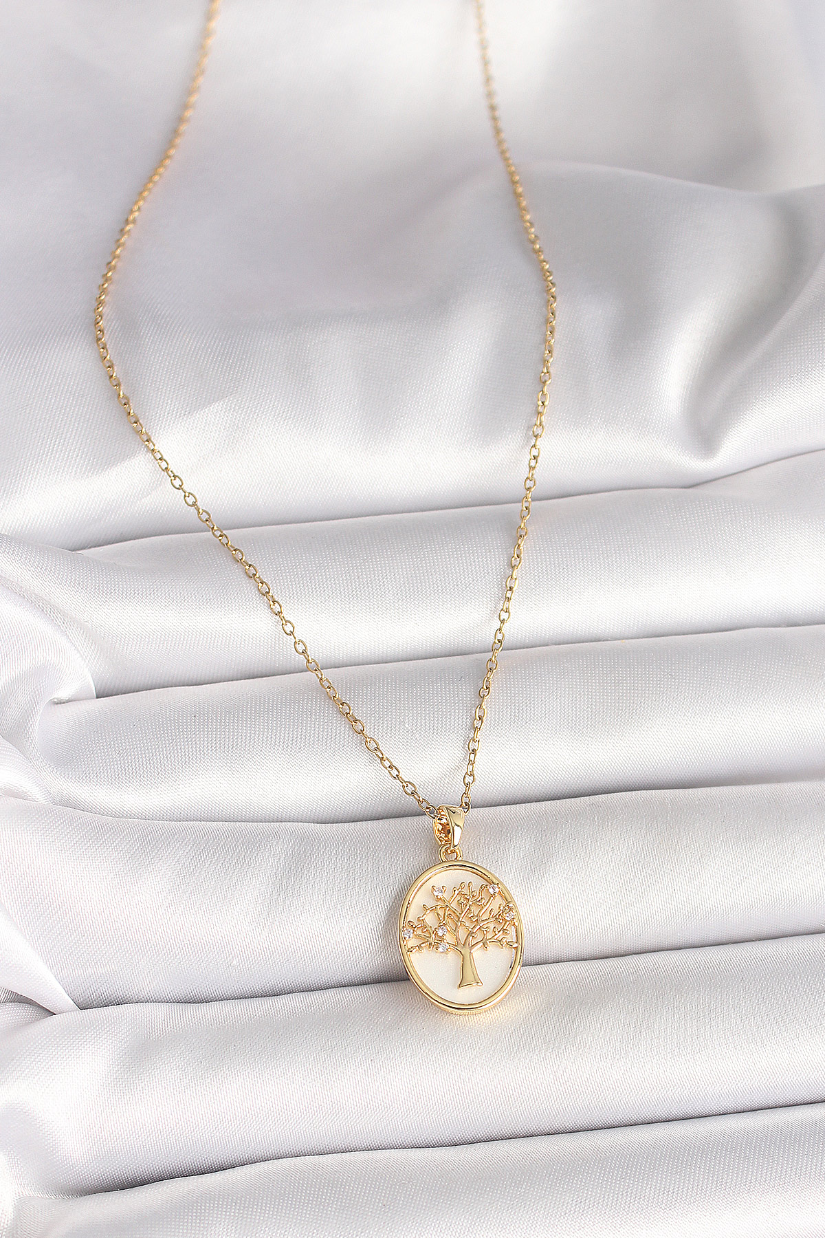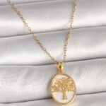 316L Çelik Gold Renk Zincir Zirkon Taş Detaylı Beyaz Mineli Ağaç İşlemeli Portre Model Kadın Kolye