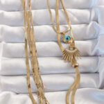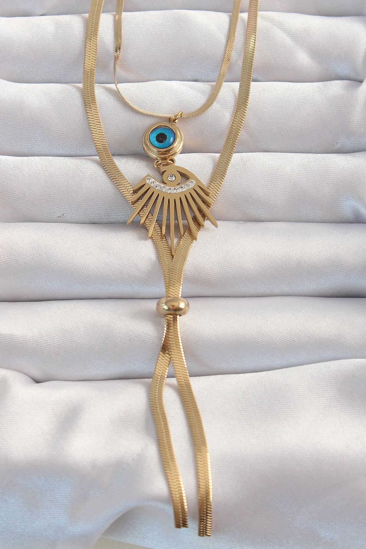 316L Çelik Gold Renk Zirkon Taşlı Göz Detay Nazarlı Uzun Asansör Model Kolye