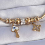 316L Çelik Gold Renk Zirkon Taşlı Yonca Detay Nazarlı Anahtar Tasarımlı Bileklik