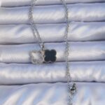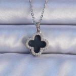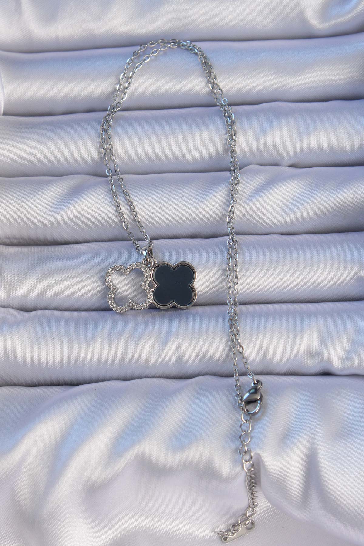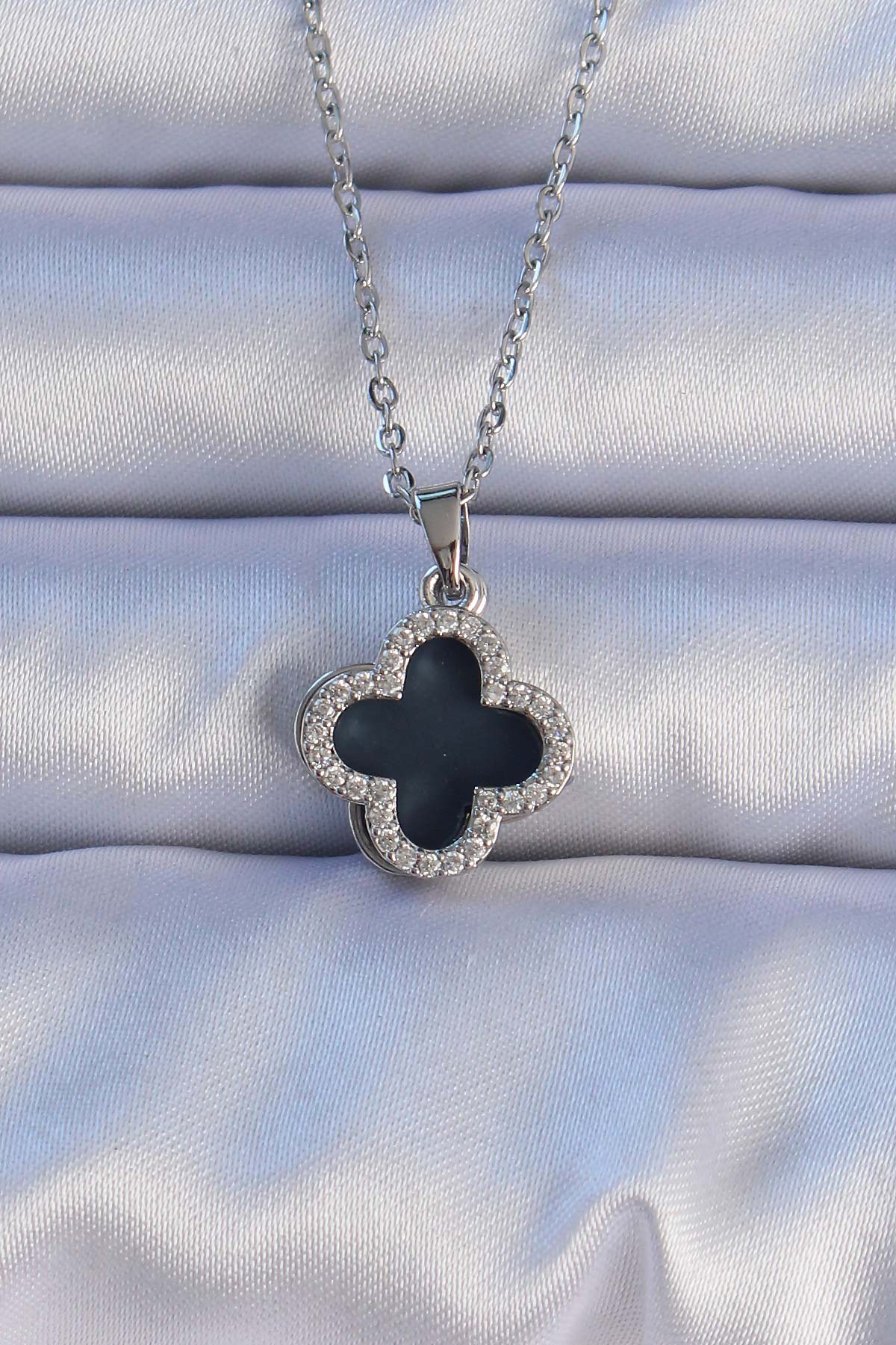 316L Çelik Gümüş Renk Siyah Mineli Zirkon Taşlı Yonca Figürlü Kolye