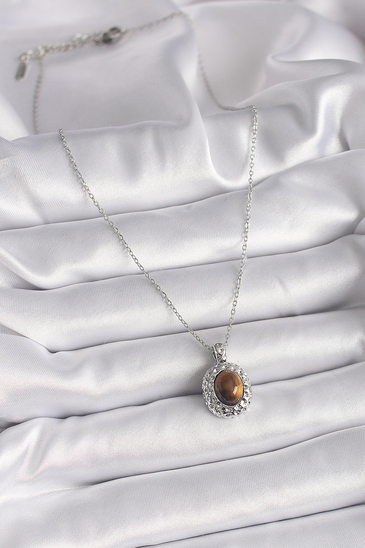 316L Çelik Gümüş Renk Zincir Kehribar Boncuk Model Kadın Kolye