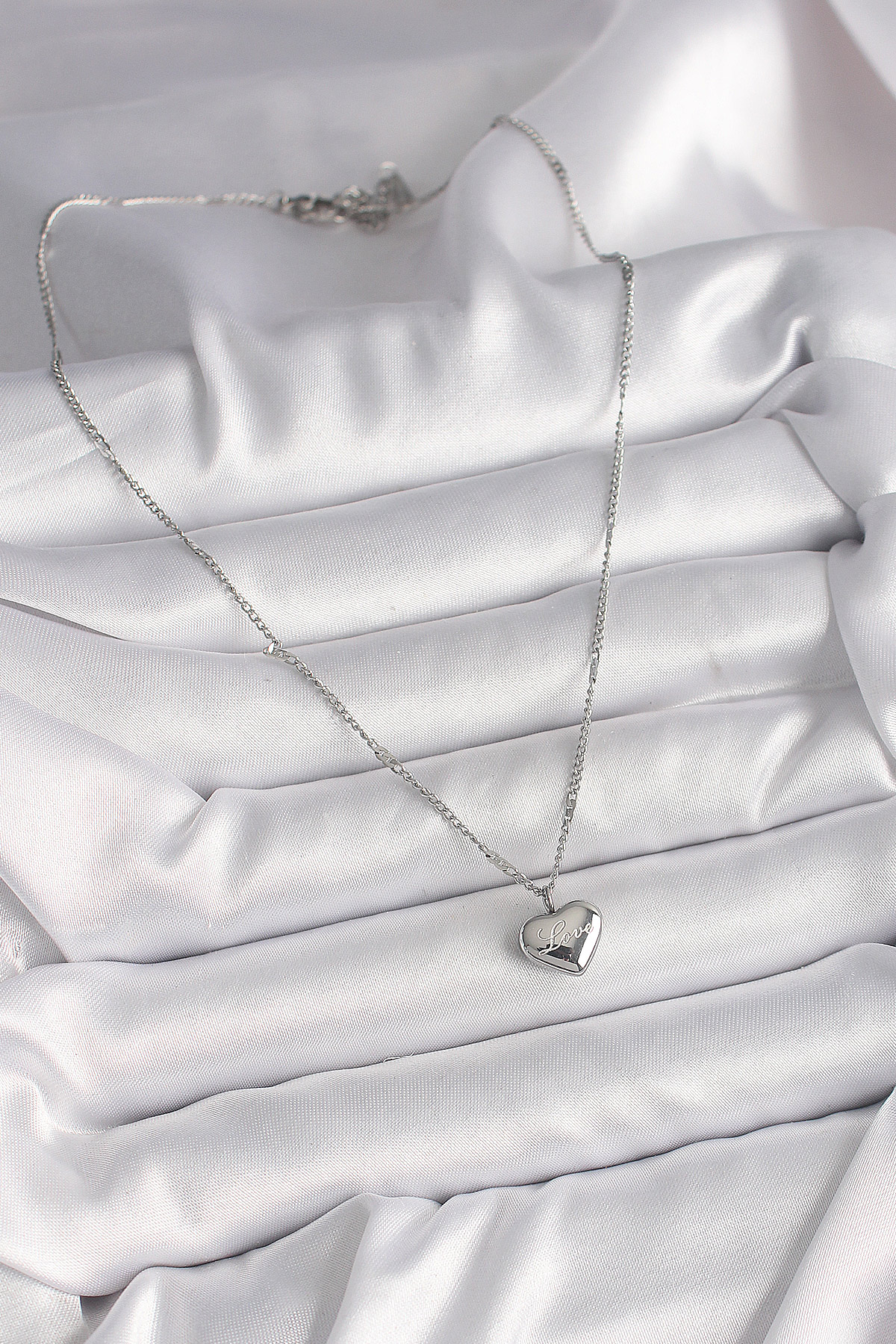 316L Çelik Gümüş Renk Zincir Love İşleme Kalp Figür Kadın Kolye