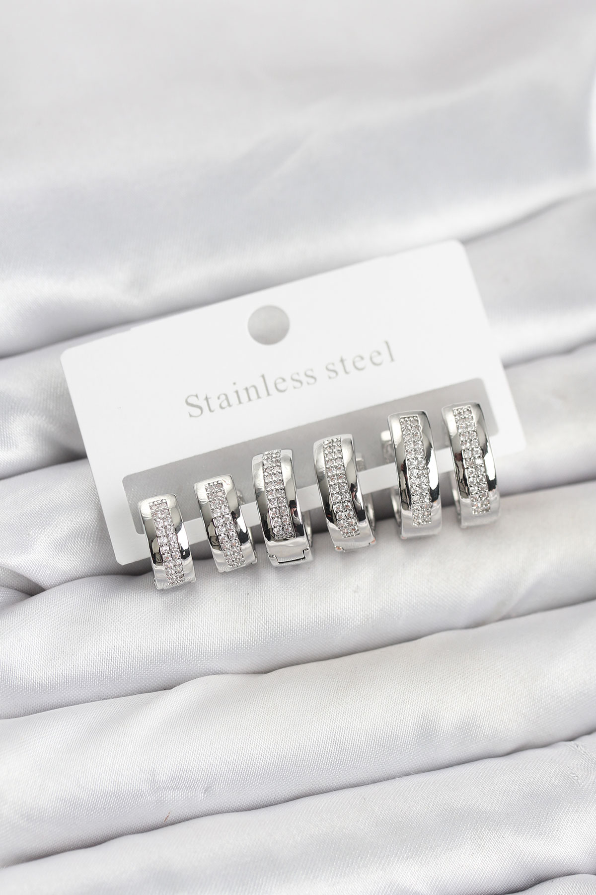 316L Çelik Gümüş Renk Zirkon Taşlı Halka Küpe Seti