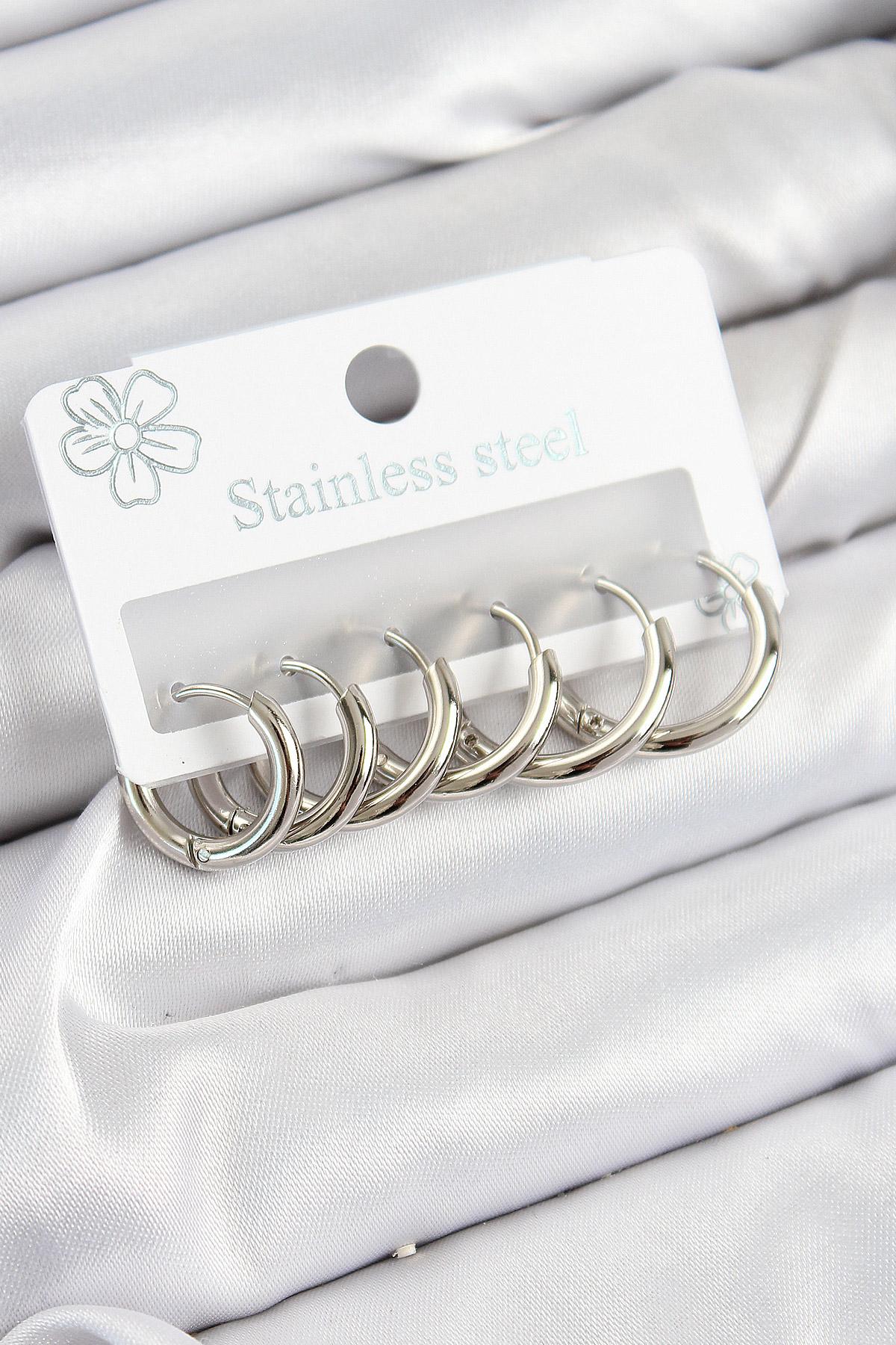 316L Çelik Halka Model Gümüş Renk 3’lü Set Kadın Küpe