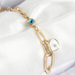 316L Çelik Nazar Boncuğu Ve Zirkon Taşlı Kalp Model Gold Renk Kadın Bileklik