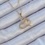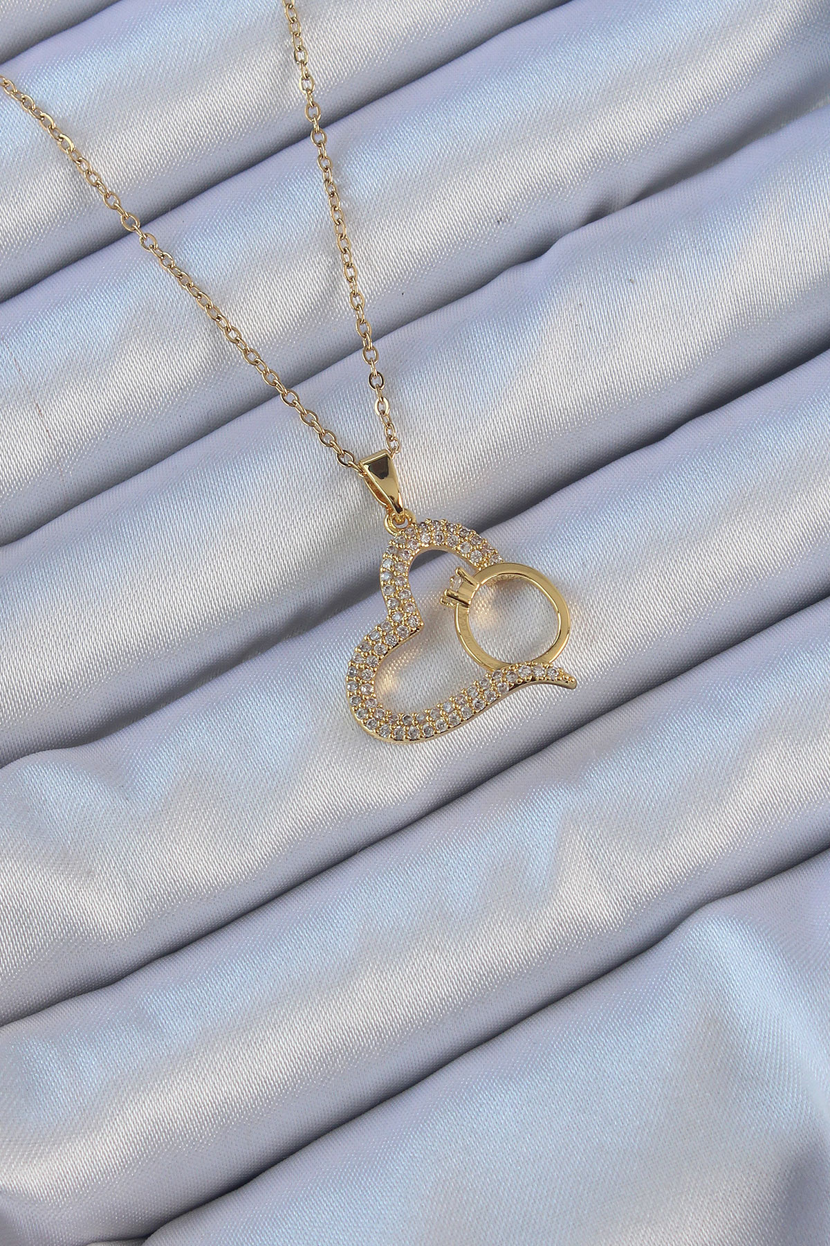 316L Çelik Zincir Altın Renk Zirkon Taşlı Yüzüklü Kalp Kolye