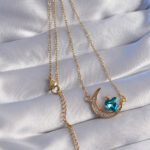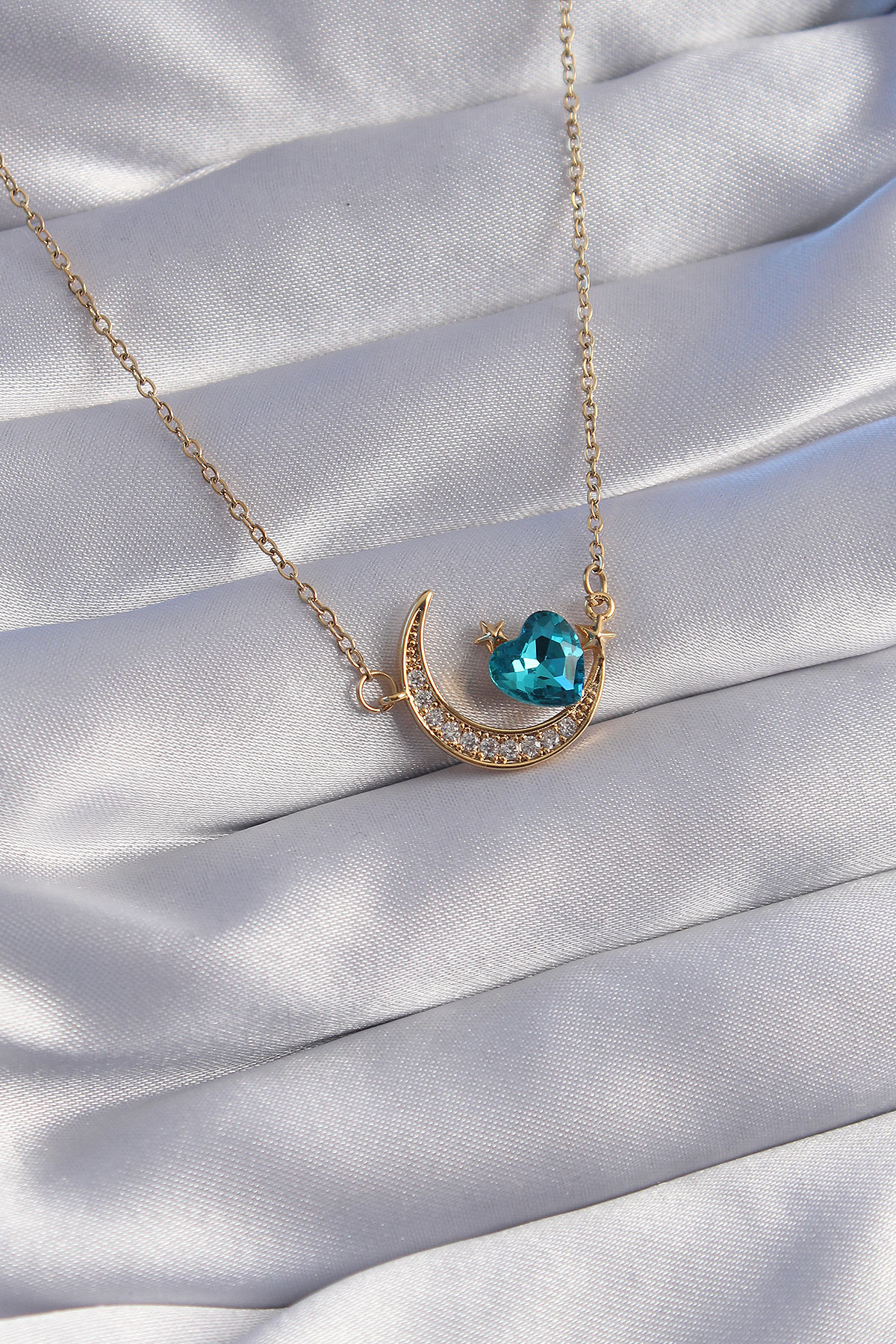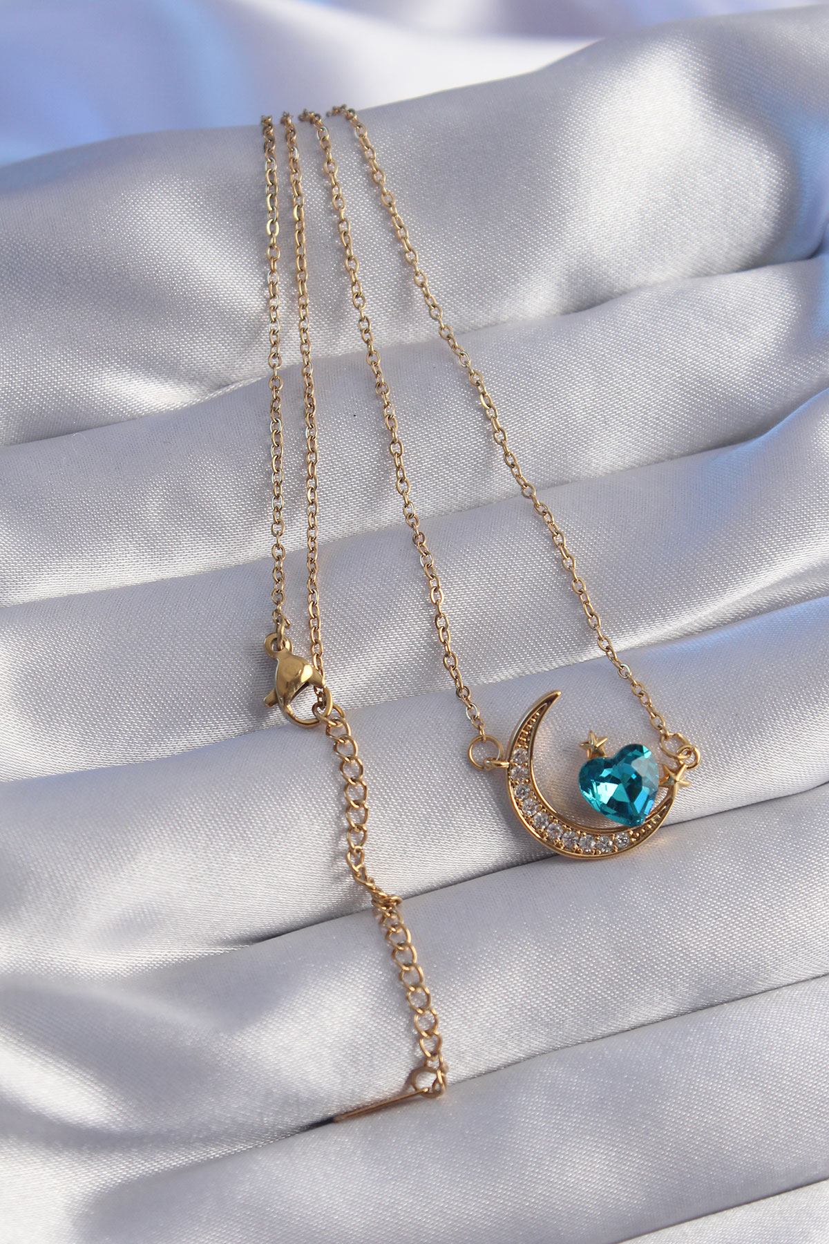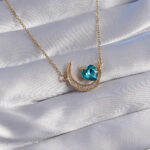 316L Çelik Zincir Gold Renk Mavi Zirkon Taşlı Ay Tasarımlı Kolye
