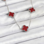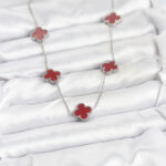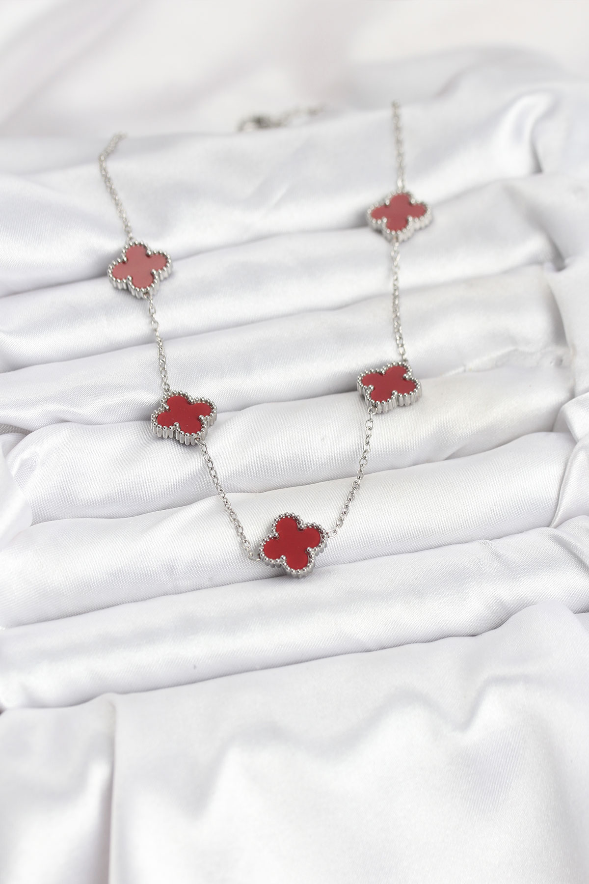 316L Çelik Zincir Gümüş Renk Bordo Renk Yonca Kadın Kolye