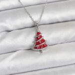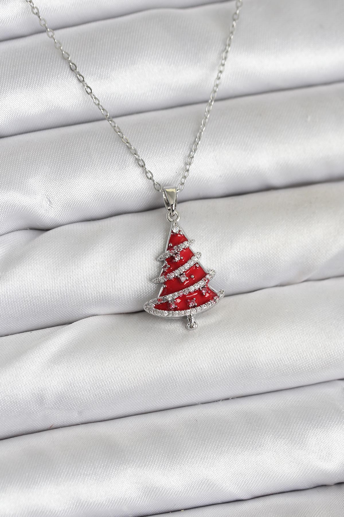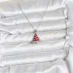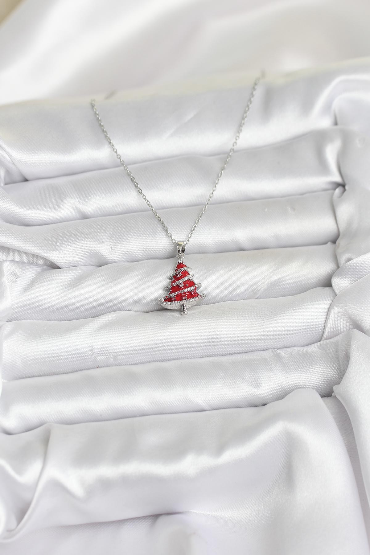 316L Çelik Zincir Gümüş Renk Kırmızı Çam Ağacı Model Yılbaşı Temalı Kadın Kolye