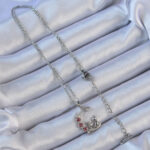 316L Çelik Zincir Gümüş Renk Kırmızı Gül Detay Kedi Figür Zirkon Taşlı Ay Kolye
