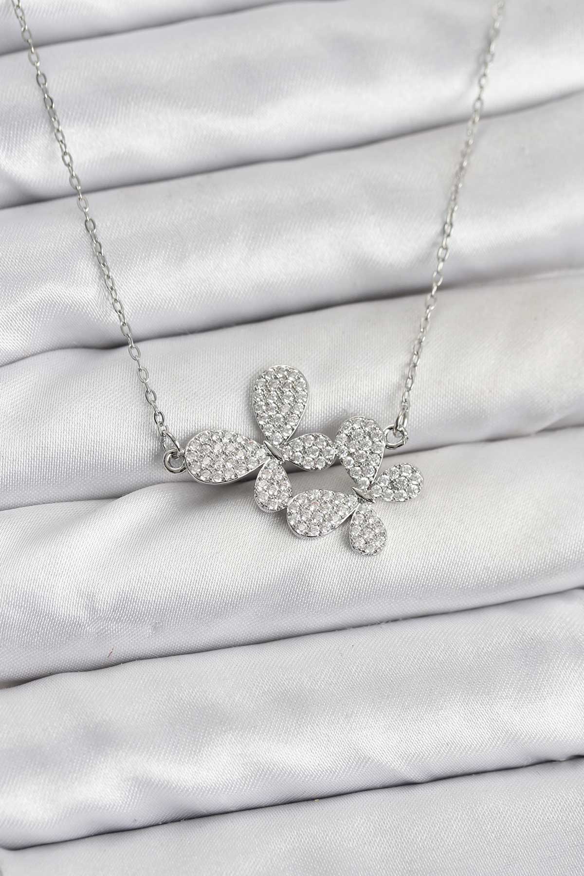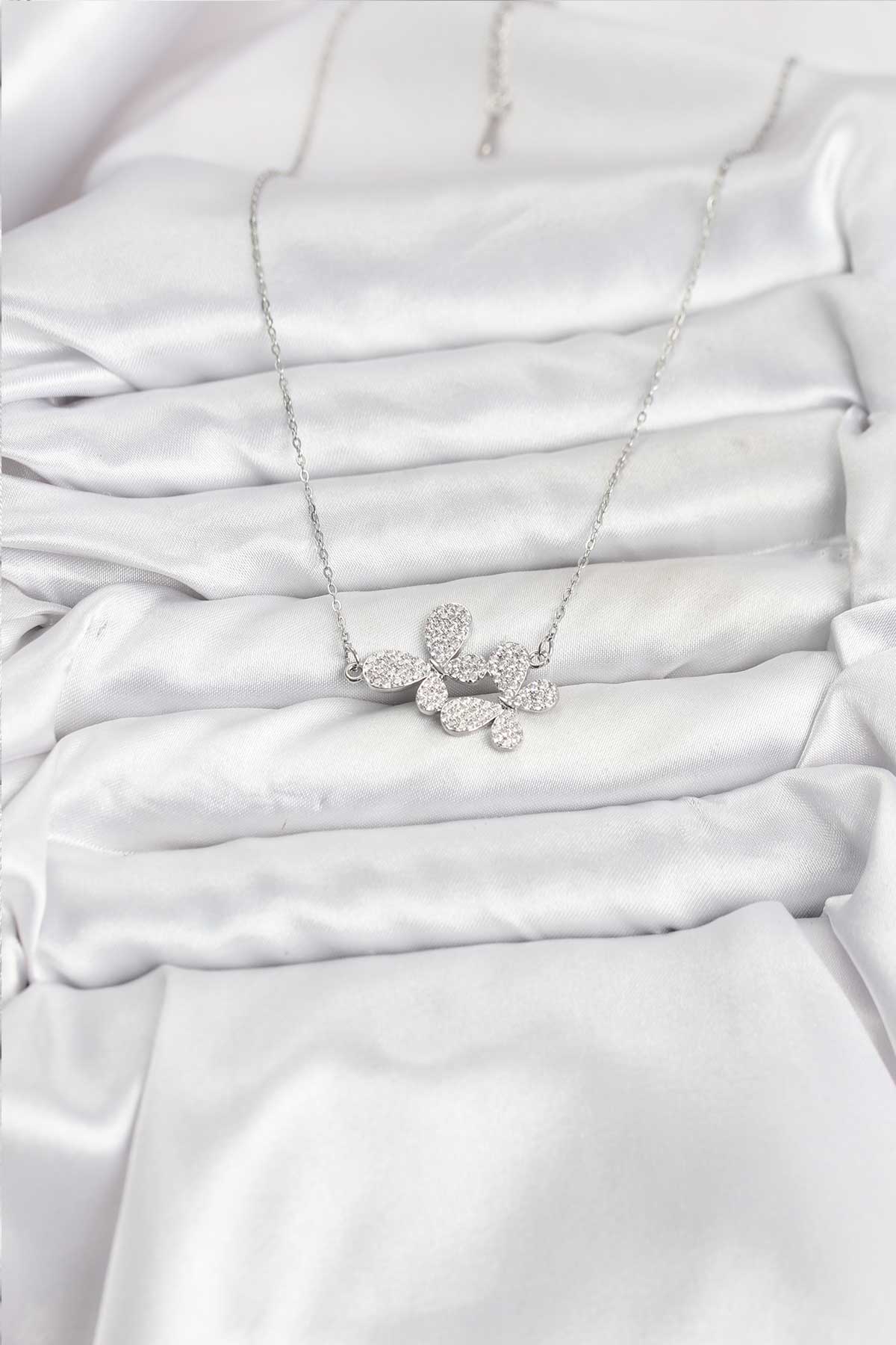 316L Çelik Zincir Gümüş Renk Zirkon Taşlı Kelebek Model Kadın Kolye