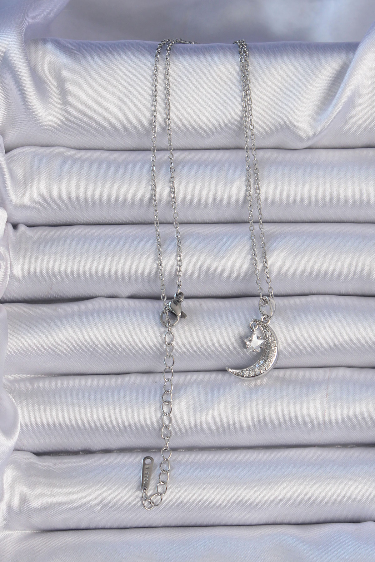 316L Çelik Zincir Gümüş Renk Zirkon Taşlı Sallantılı Ay Yıldız Kolye