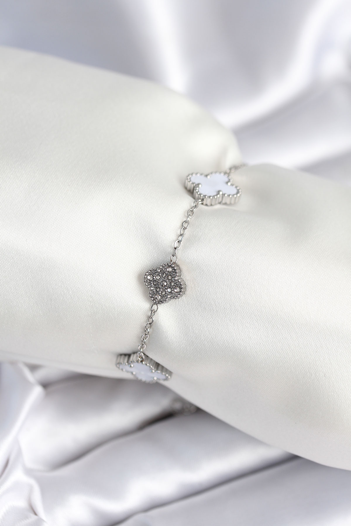 316L Çelik Zincir Gümüş Renk Zirkon Taşlı Yonca Beyaz Kadın Bileklik