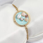 316L Çelik Zincir Turkuaz Mineli Sanatsal Portre İnci Detaylı Çiçek Model Gold Renk Kadın Bileklik
