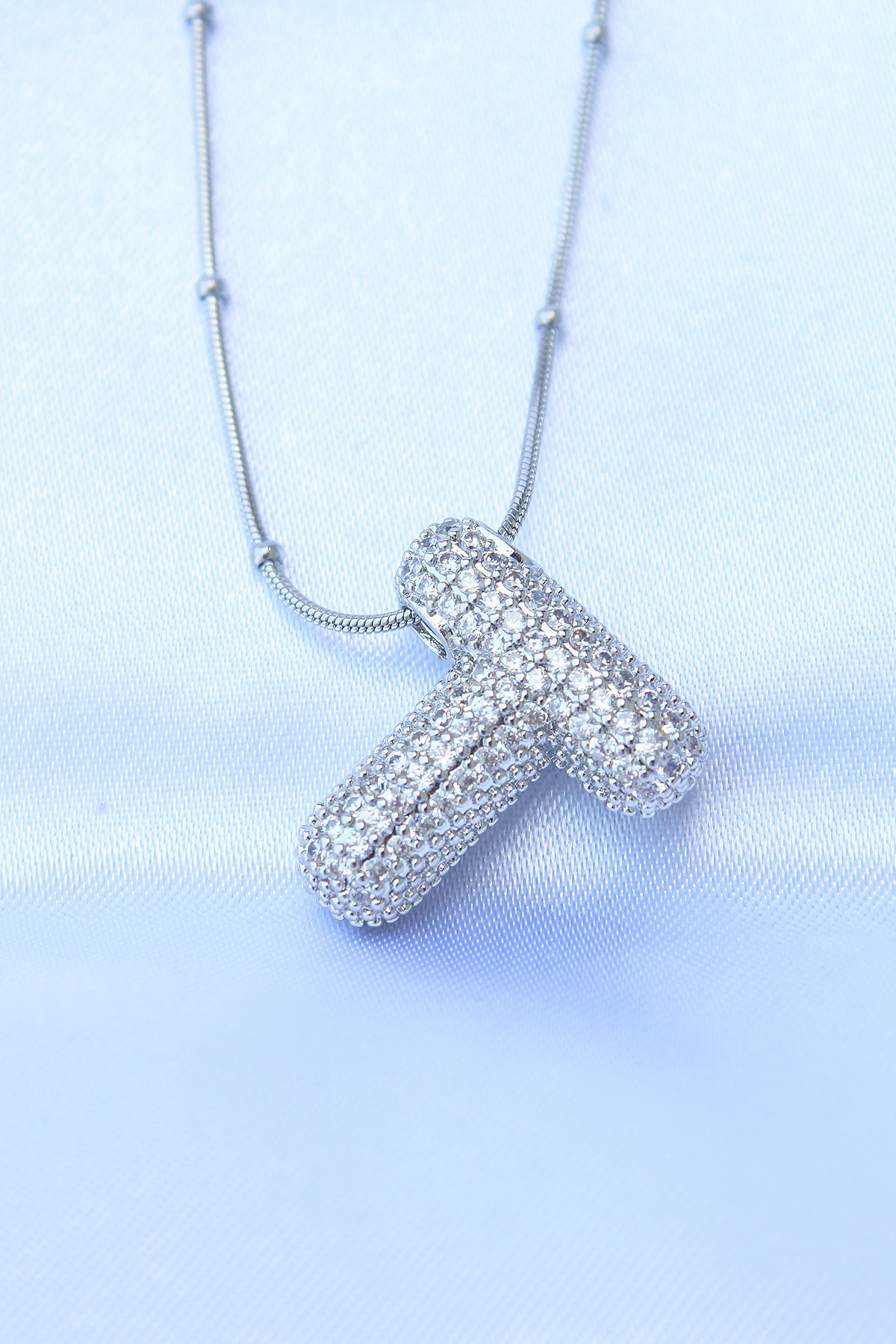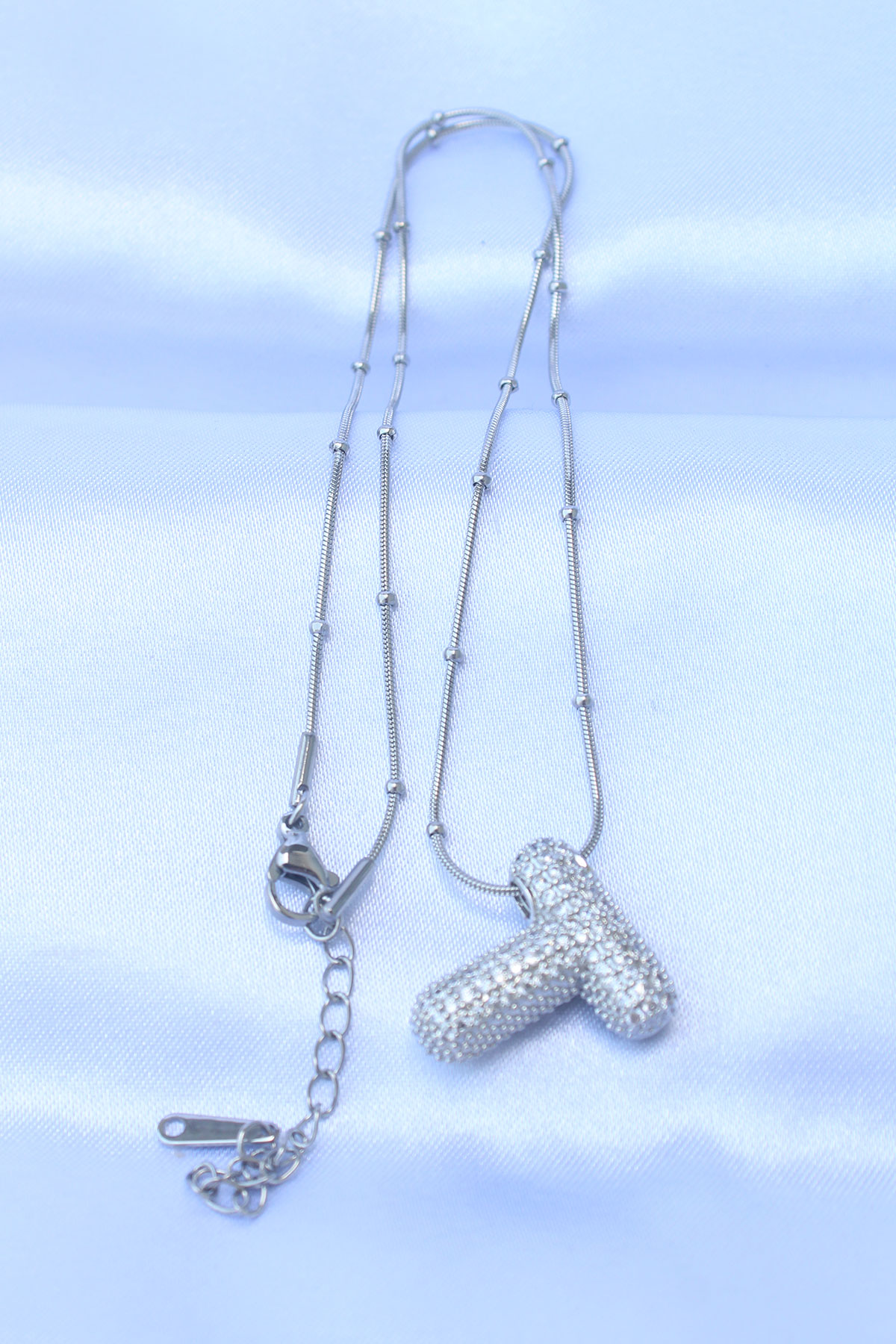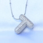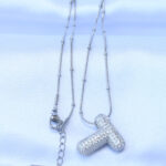 316L Çelik Zincirli Zirkon Taşlı T Harfli Gümüş Renk Bubble Kolye