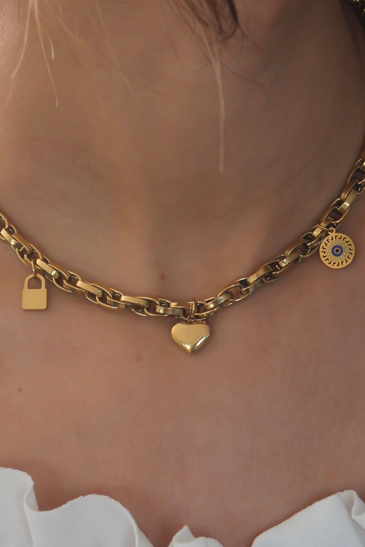 Çelik Gold Renk Kalın Zincir Model Kalp Figür Kadın Kolye