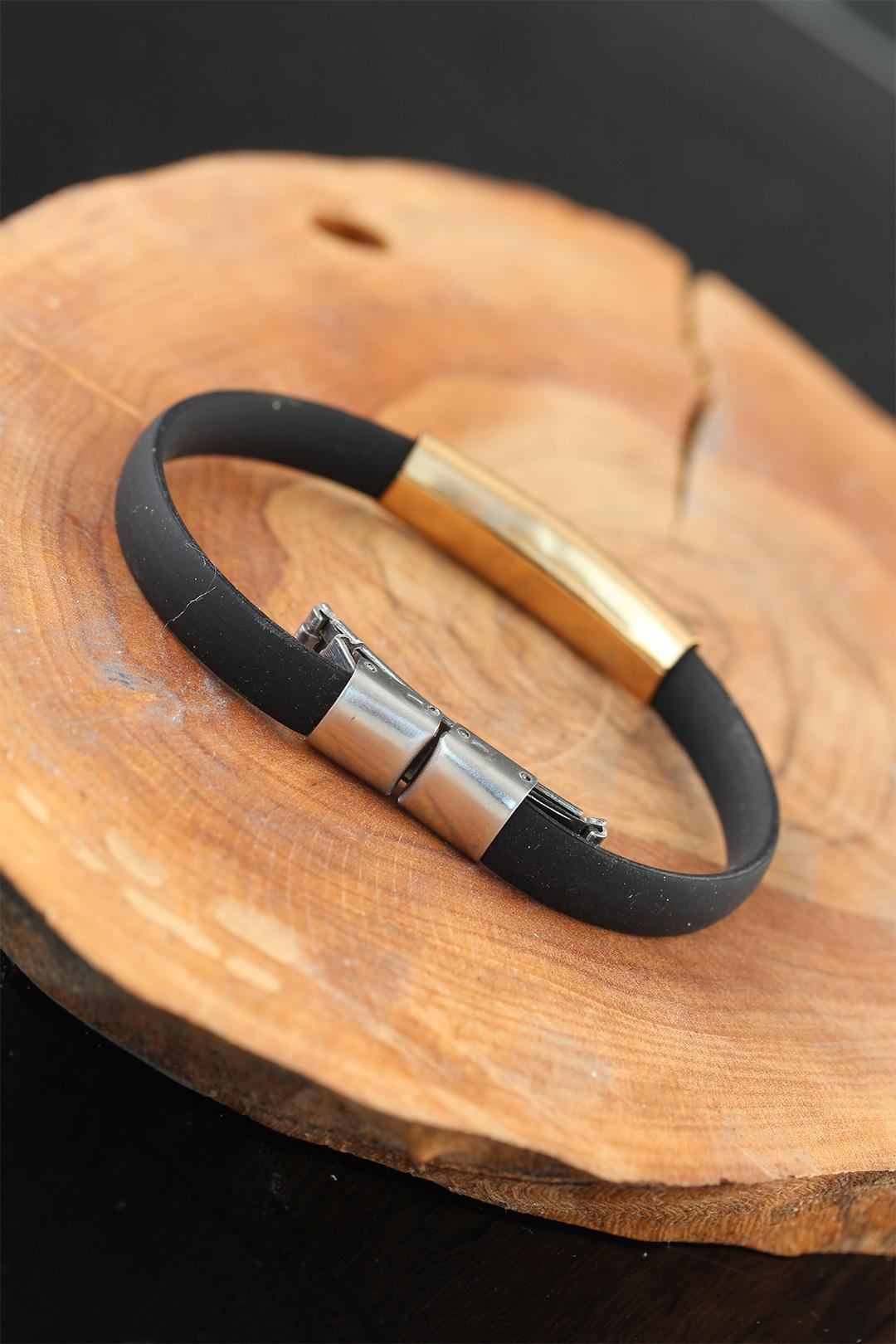 Gold Renk Çelik Yıldızlı Tasarım Siyah Renk Silikon Erkek Bileklik