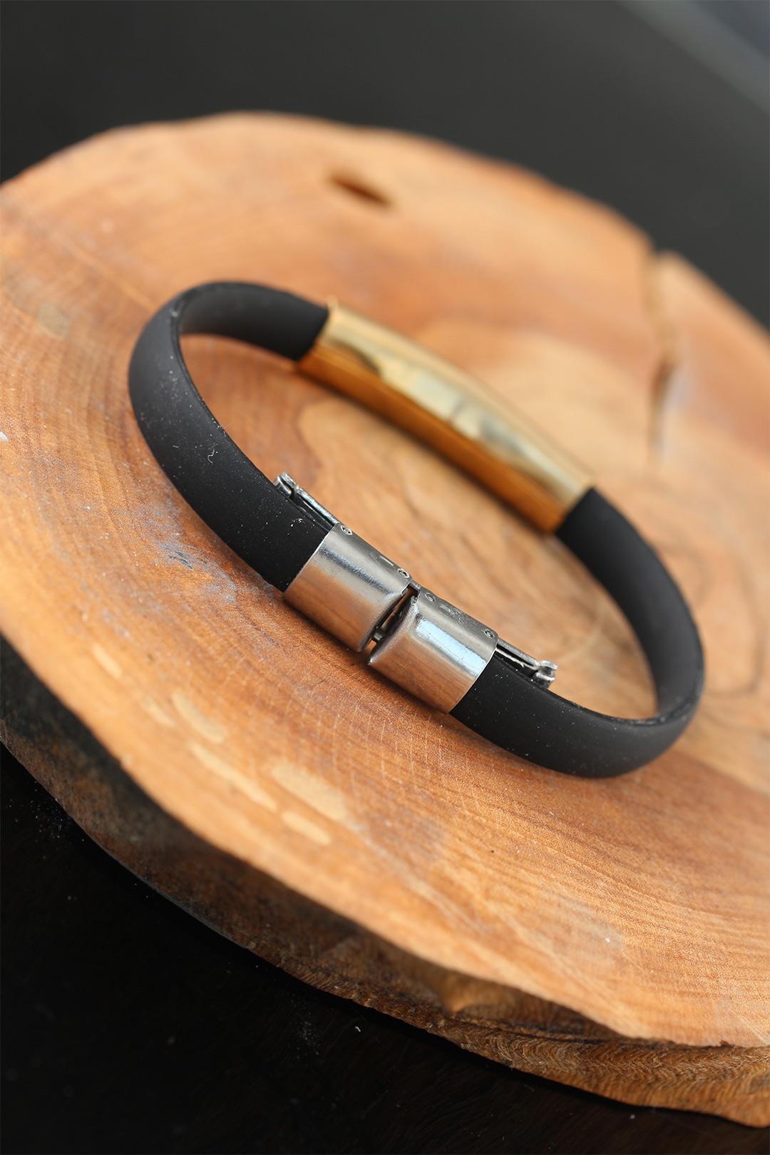 Gold Renk Metal Tasarım Siyah Renk Silikon Erkek Bileklik