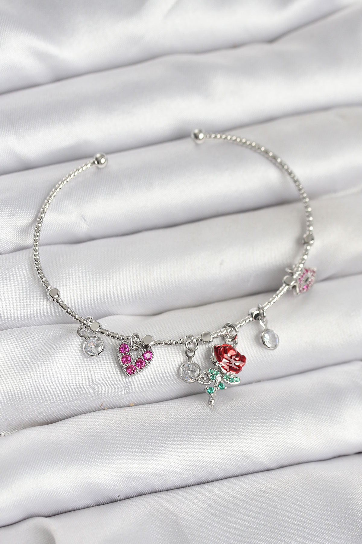 Gül Charmlı Gümüş Renk Pirinç Kadın Bileklik