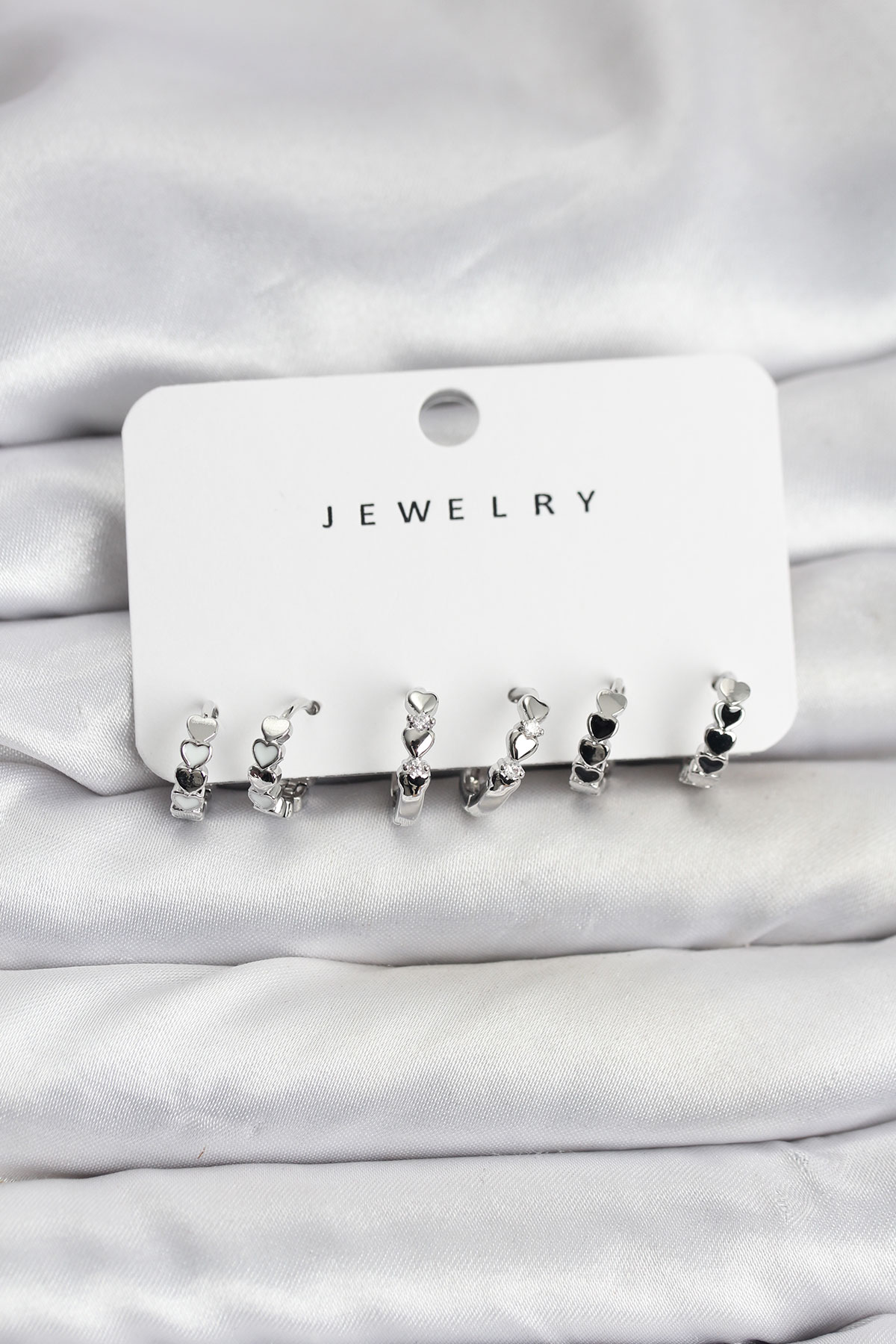 Gümüş Renk Pirinç Minimal Kalp Detaylı Kadın Küpe Seti