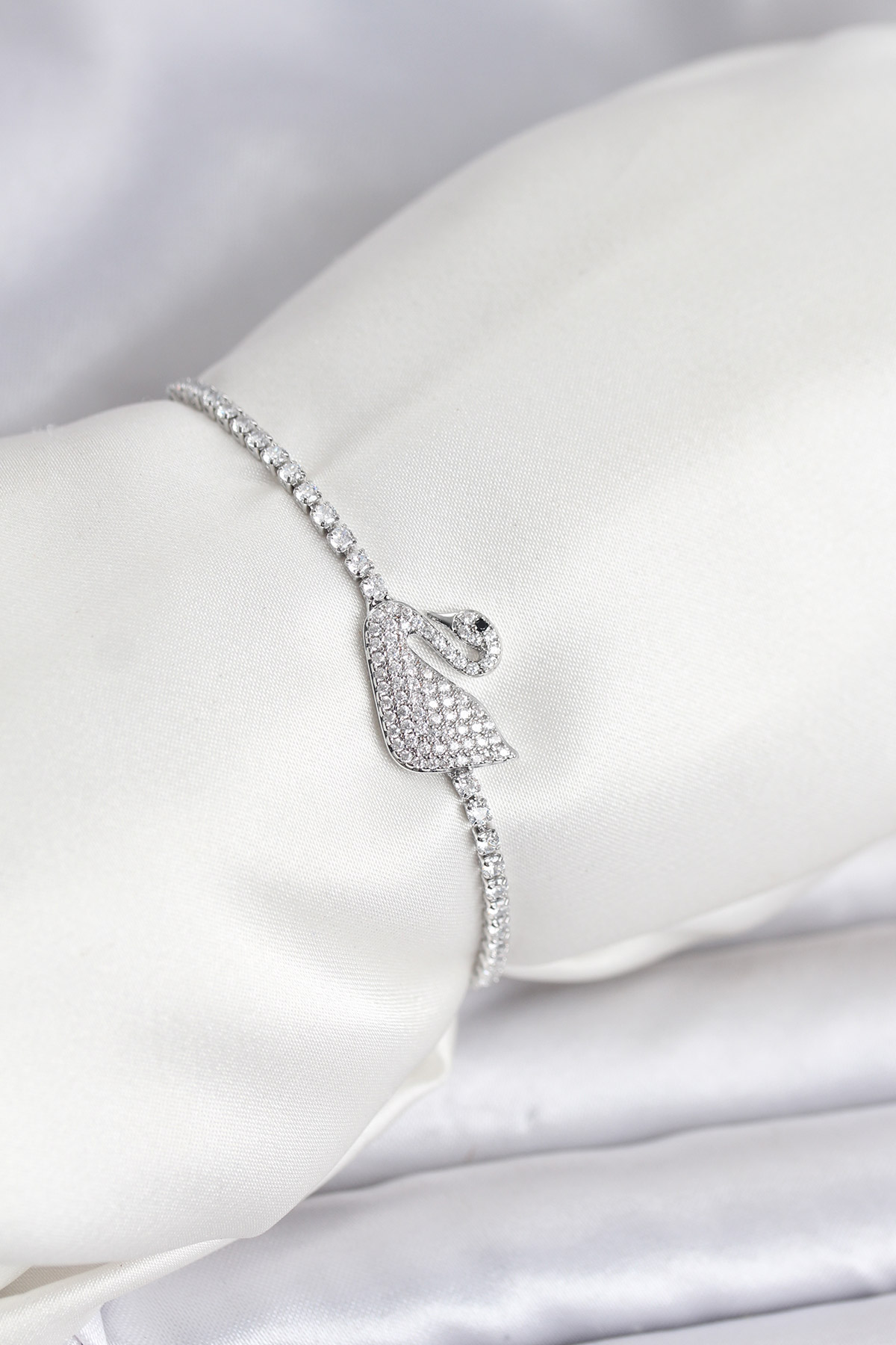 Kuğu Model Zirkon Taşlı Gümüş Renk Asansörlü Su Yolu Bileklik