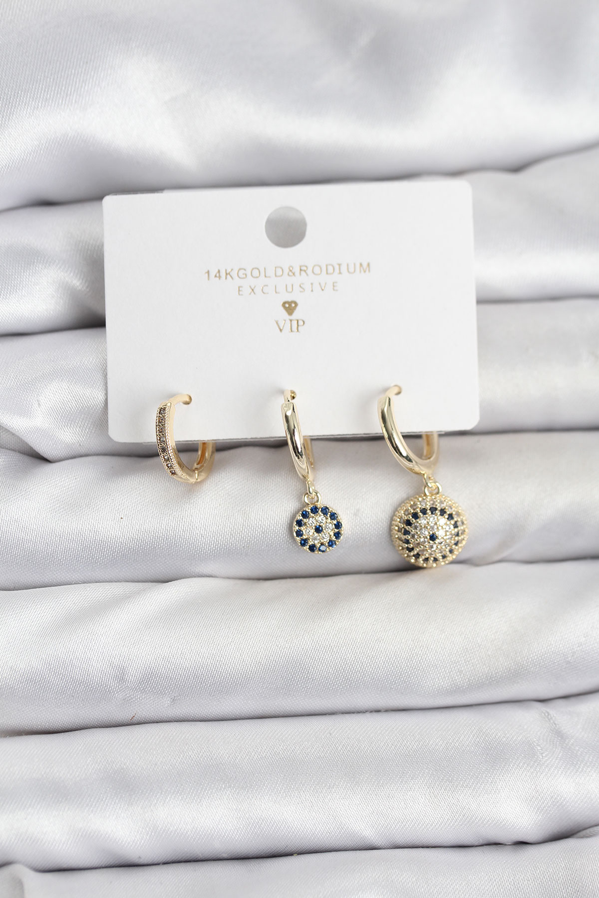 Nazar Model Gold Renk Pirinç 3’lü Kadın Küpe Seti