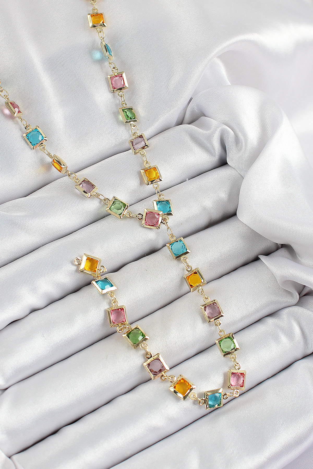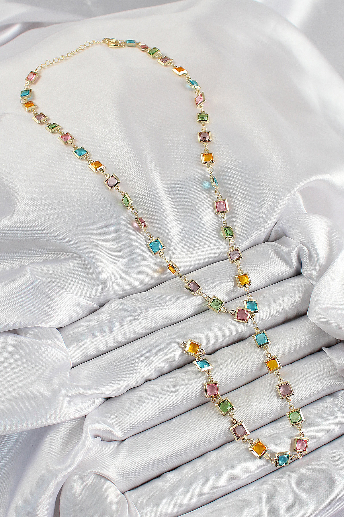 Pirinç Asorti Kare Model Gold Renk Zirkon Taşlı Y Kolye