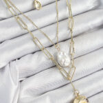 Pirinç Çoklu Zincirli İncili Deniz Kabuğu Model Gold Renk Kadın Kolye