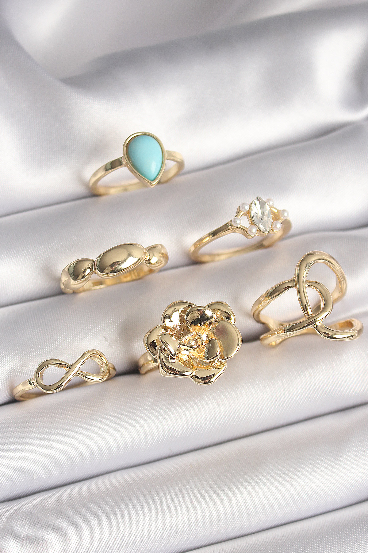 Pirinç Gold Renk Çiçek Model Model Sonsuzluk Zirkon Taş Detaylı 6’Lı Kadın Yüzük Seti