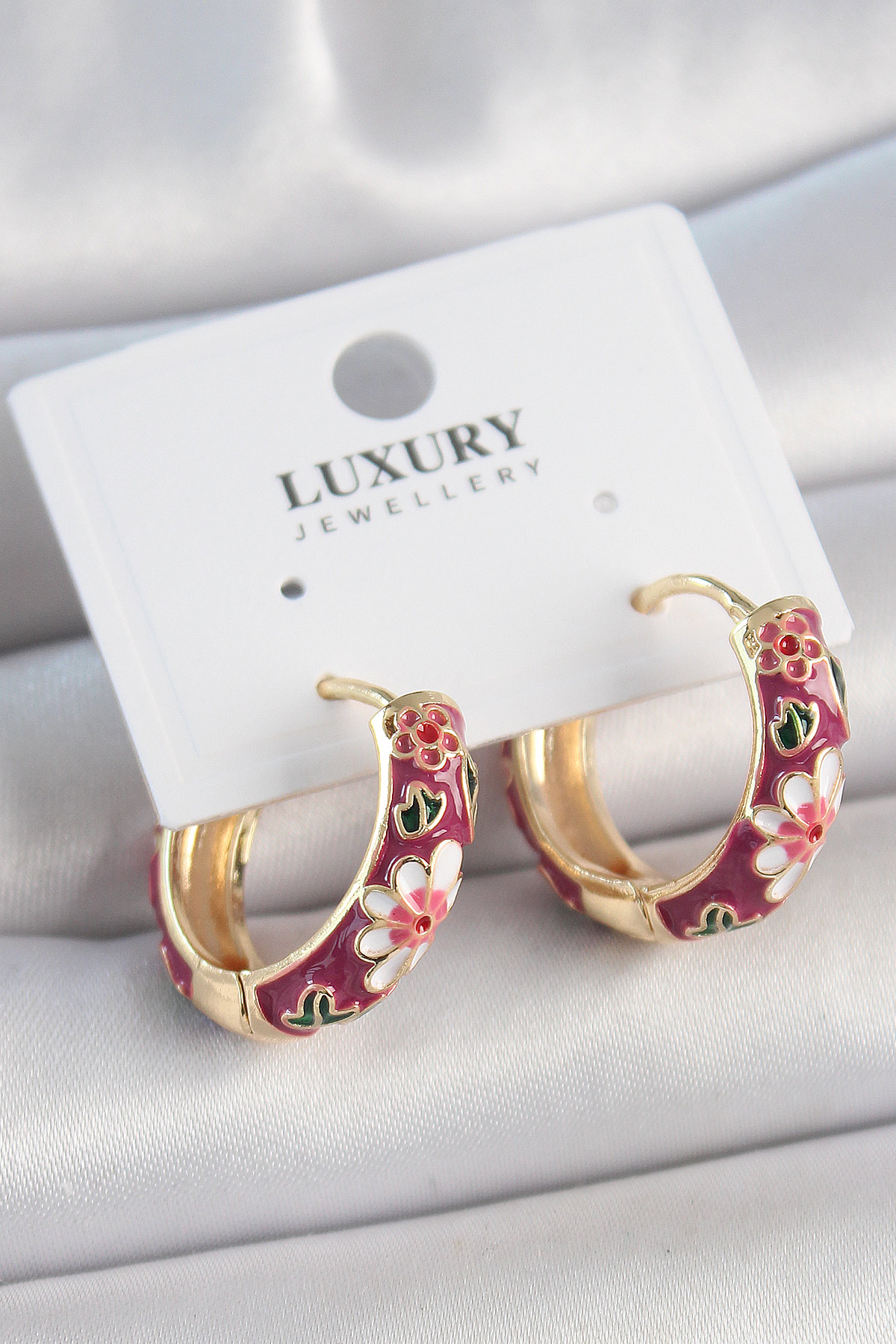 Pirinç Gold Renk Halka Mor Çiçek Mineli Kadın Küpe