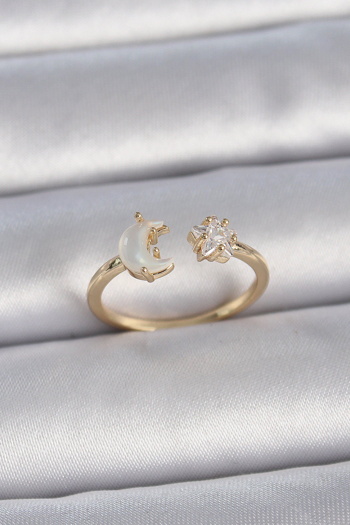 Pirinç Gold Renk İncili Hilal Zirkon Taşlı Yıldız Ayarlanabilir Model Kadın Yüzük
