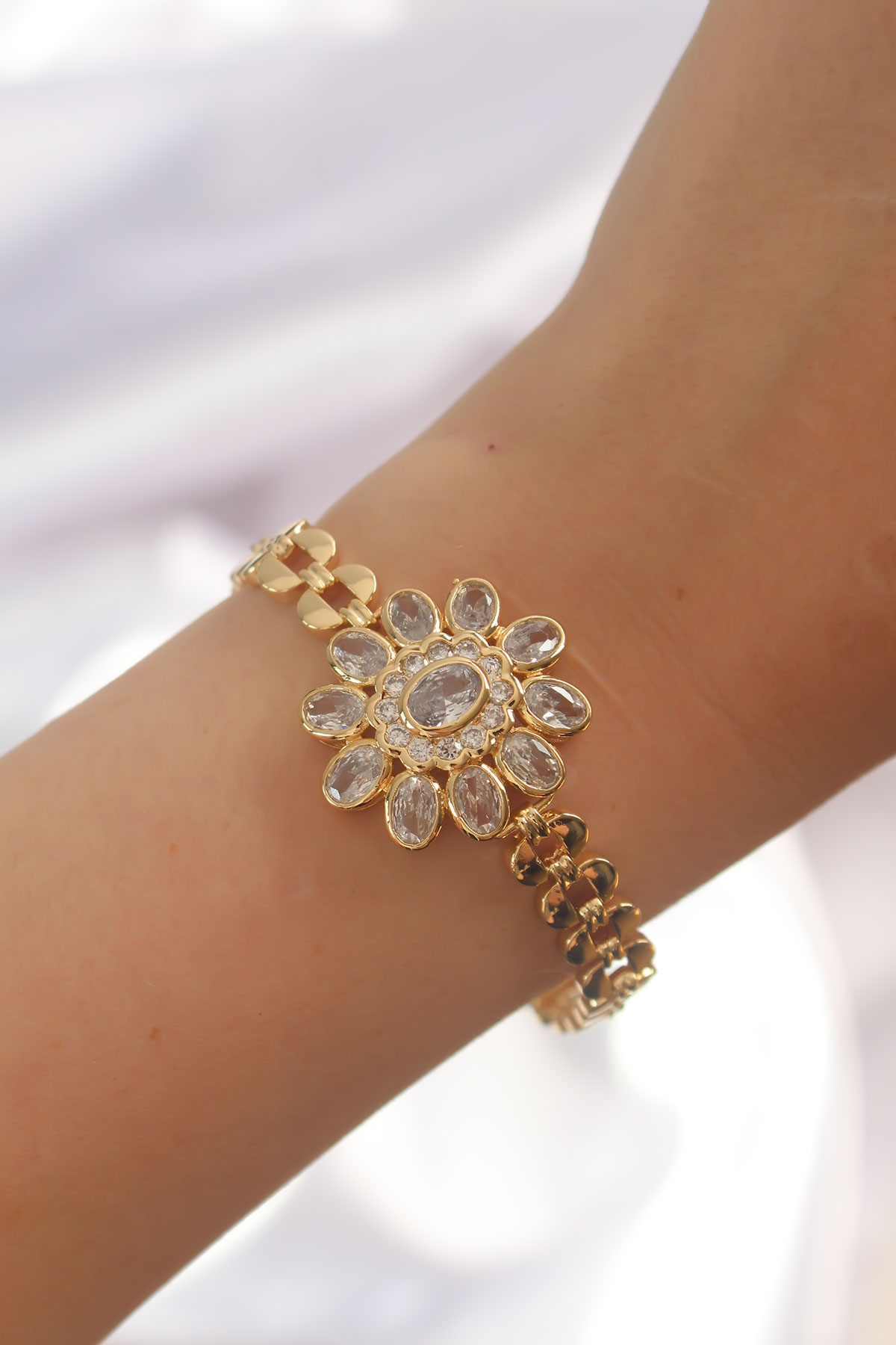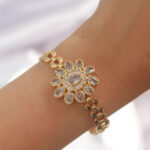 Pirinç Gold Renk İri Zirkon Taşlı Çiçek Figürlü Bileklik