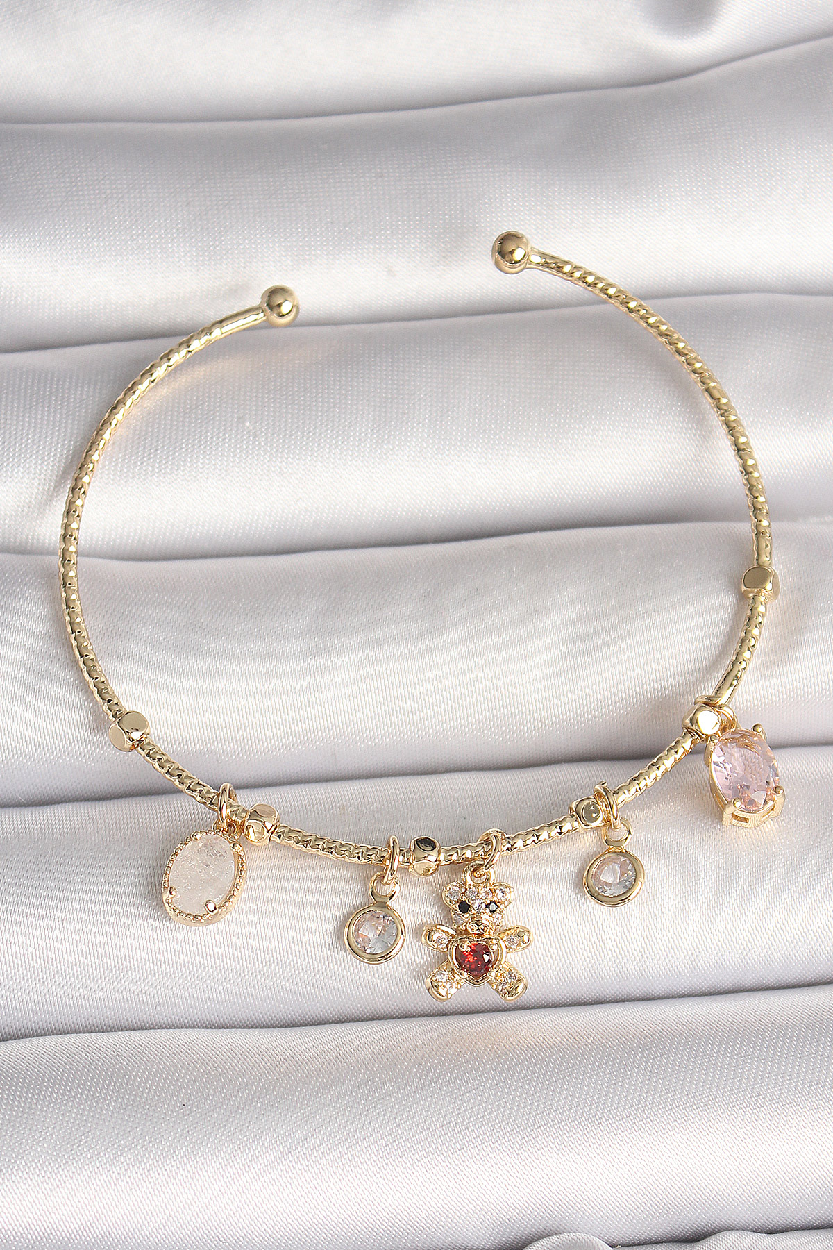 Pirinç Gold Renk Sallantı Zirkon Taşlı Ayıcık Figür Kırmızı Kalp Detay Charm Kadın Bileklik