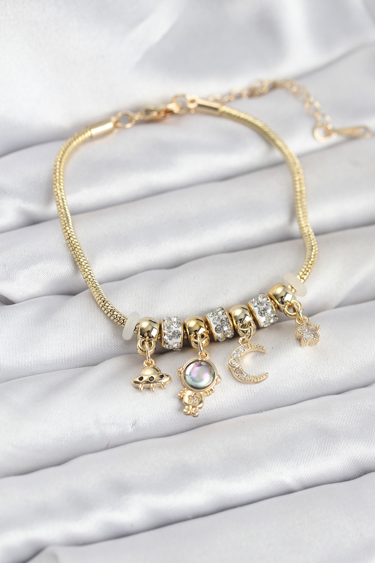 Pirinç Gold Renk Uzay Tema Charmlı Kadın Bileklik