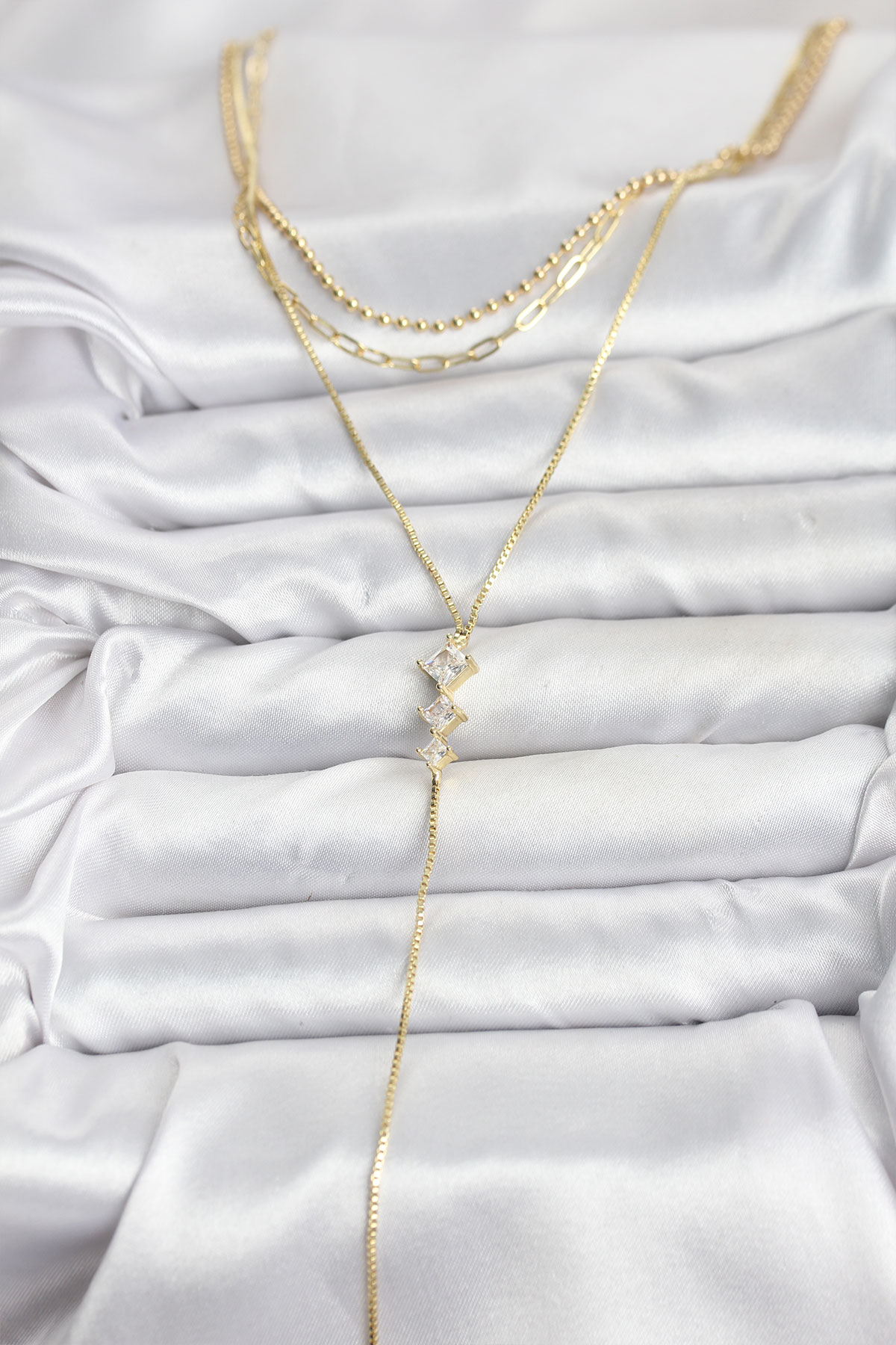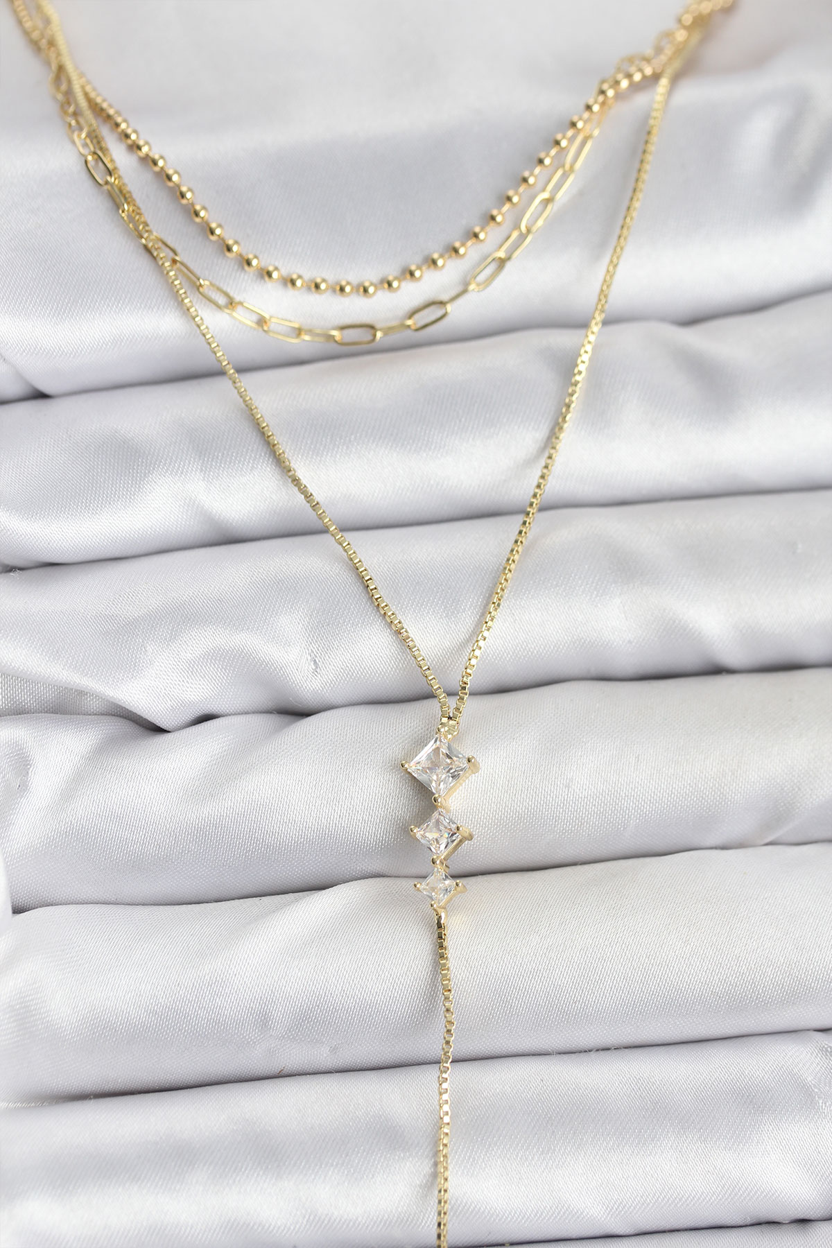 Pirinç Gold Renk Zirkon Taş Detaylı 3’lü Kombin Y Kadın Kolye